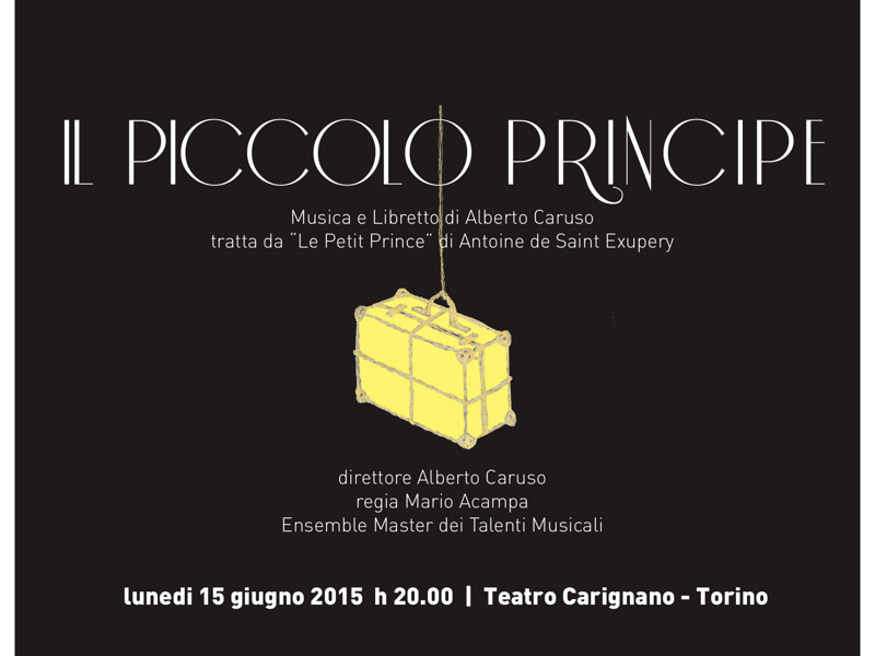 15 June 2015 Torino 12:00 AM Buy Tickets Piccolo Principe Adaptation musicale de l’œuvre de Saint Exupéry Le Petit Prince Add To Calendar Google Calendar iCal Piccolo Principe/ Teatro Carignano di Torino Adaptation musicale de l’oeuvre de Saint Exupéry Le Petit Prince Compositeur Alberto Caruso et mise en scène Mario Acampa. Rôle du Petit Prince : Richard Rittelmann Venue Details Torino